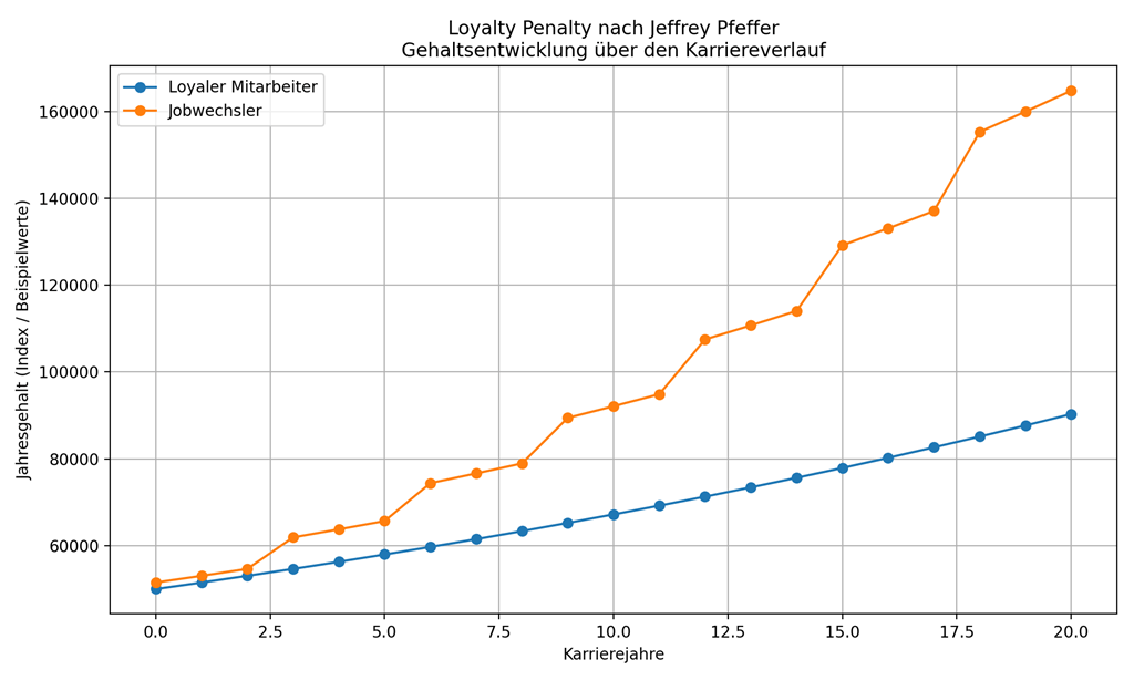 Bei einer Karriere von 30–40 Jahren führen regelmäßige Wechsel (z. B. alle 3–5 Jahre) zu einem deutlich höheren Endgehalt im Vergleich zu derselben Person, die im selben Unternehmen bleibt.